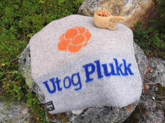 Kvalitetsprodukt i ull fra Røros Tweed med design Ut og Plukk.